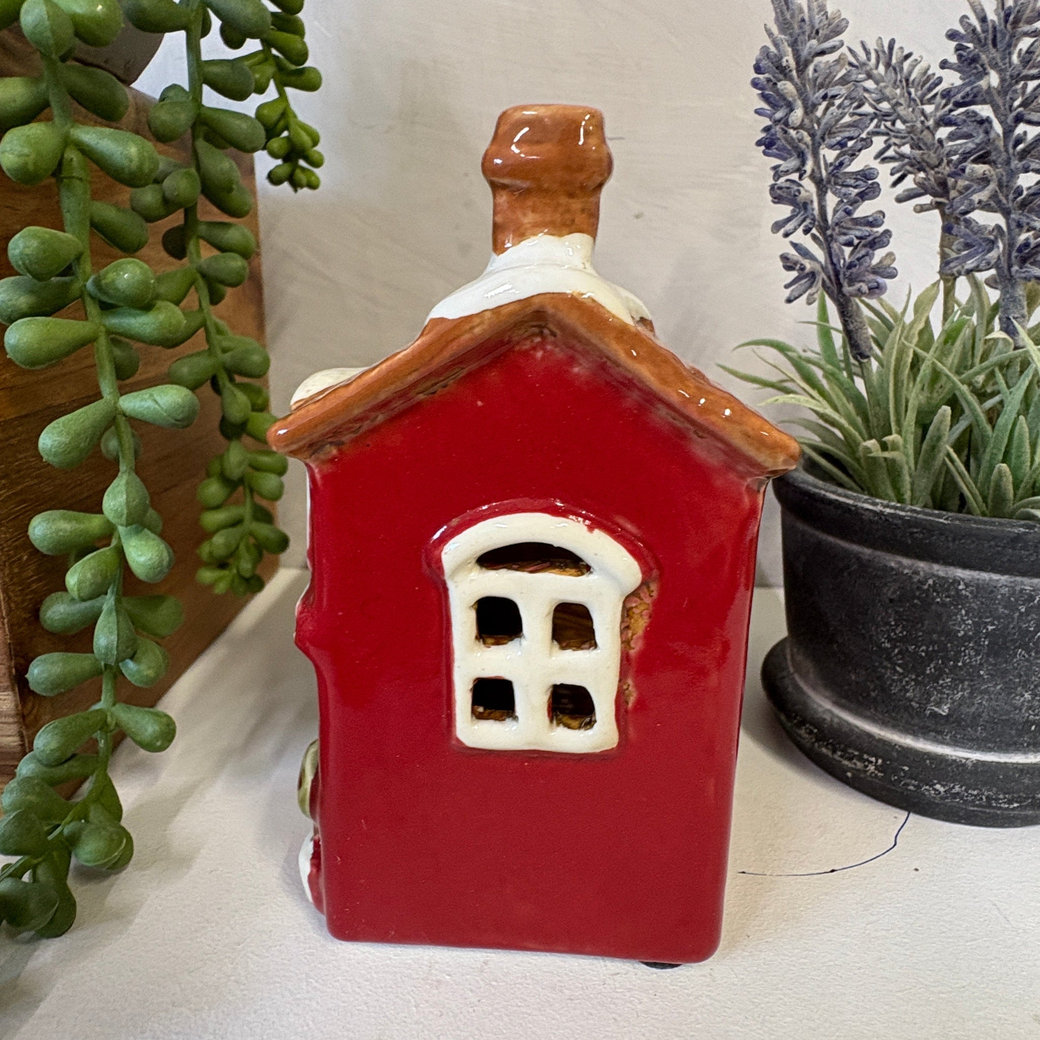 Village Pottery Ceramic Christmas Toy Shop Tea Light Holder with a gap in back to insert a tea light . The glow from the tea light adds a lovely ambience to any room . Im happy to gift wrap and add a candle for a special gift .
