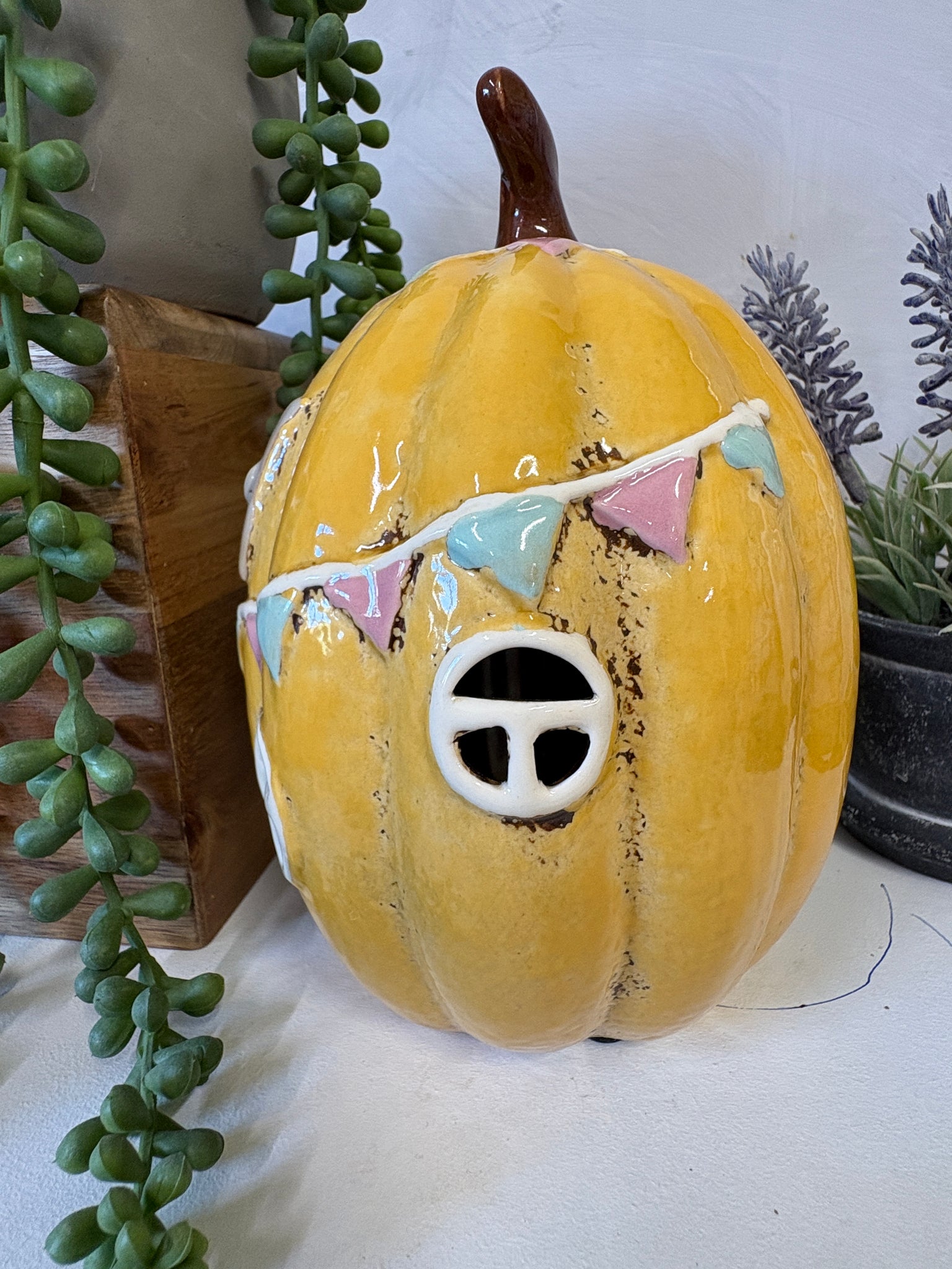 This has to be my favourite ! The village pottery pumpkin house , its so beautifully designed and looks stunning when lit . It measures 17cm x 13cm x 11cm and comes well wrapped . Im happy to gift wrap and add a tea light for that special gift.